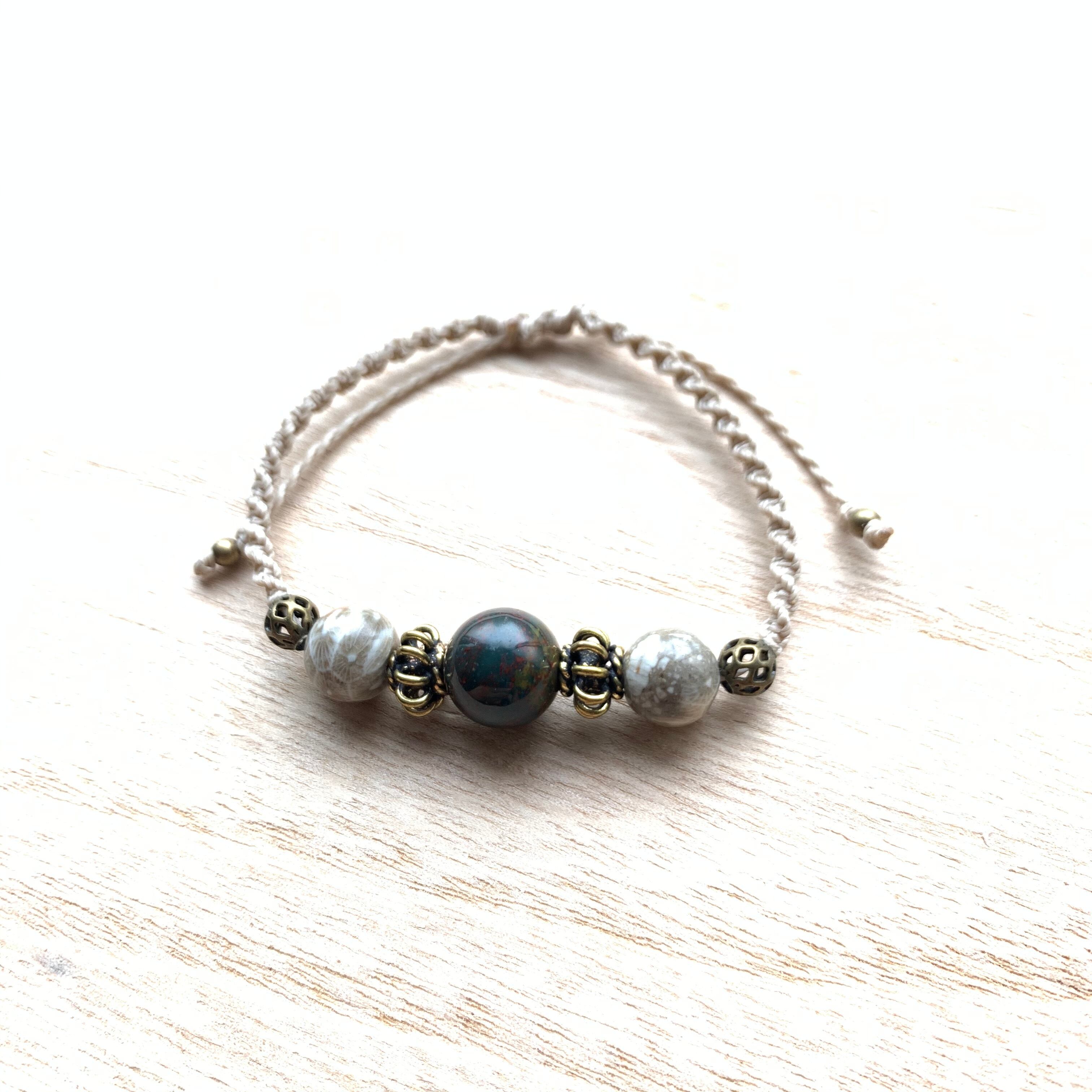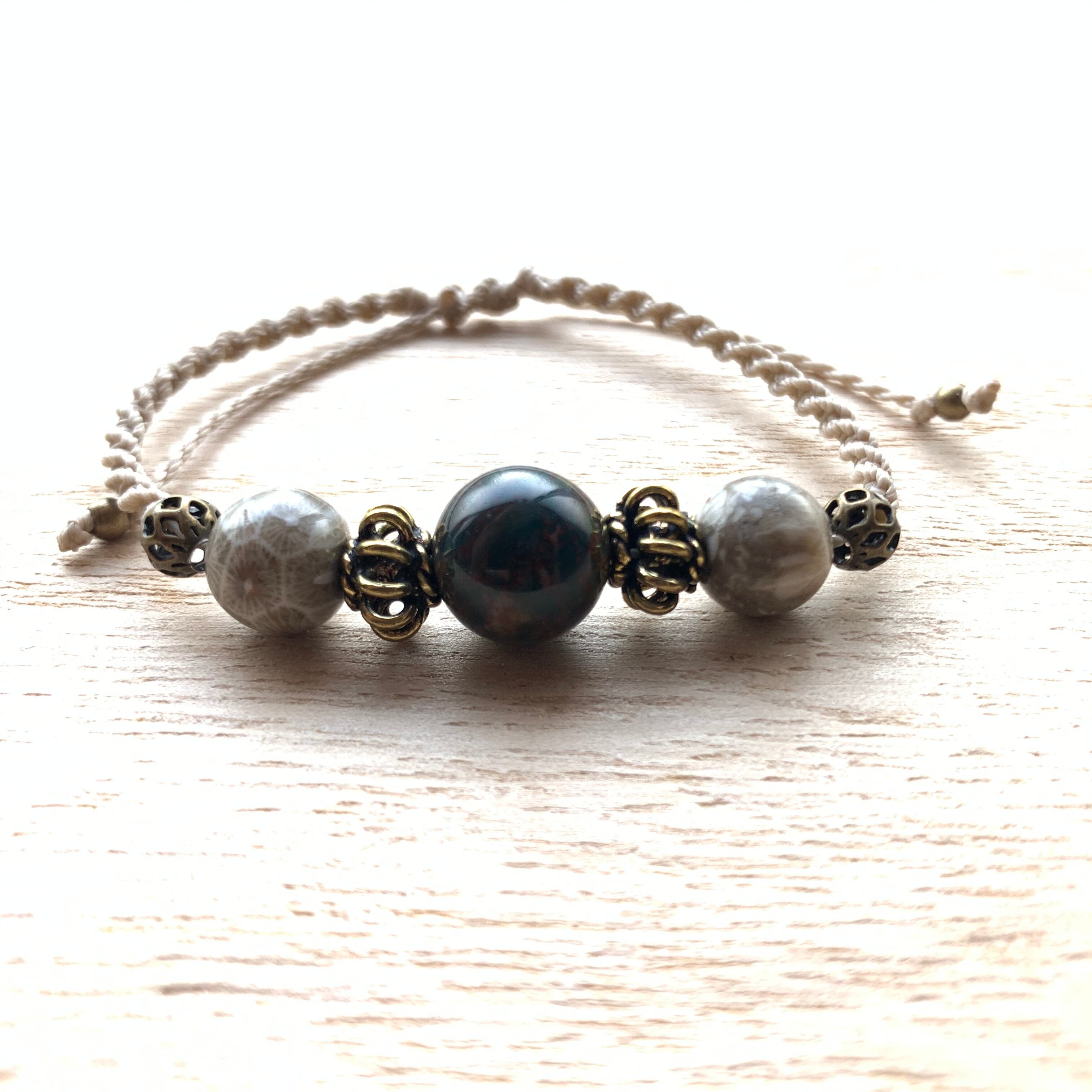 ブラッドストーンとフォッシルコーラルのシンプルなマクラメ編みブレスレットです。