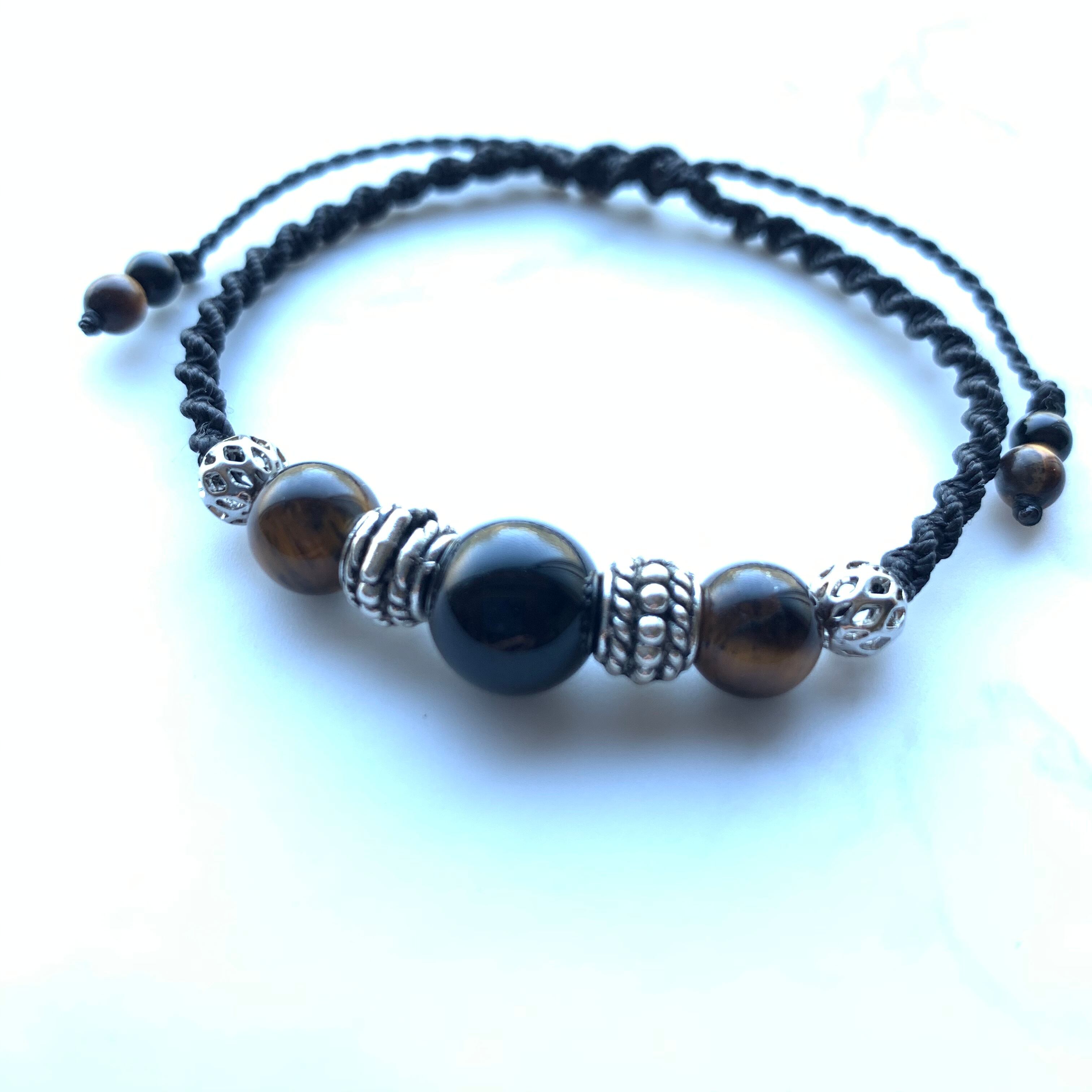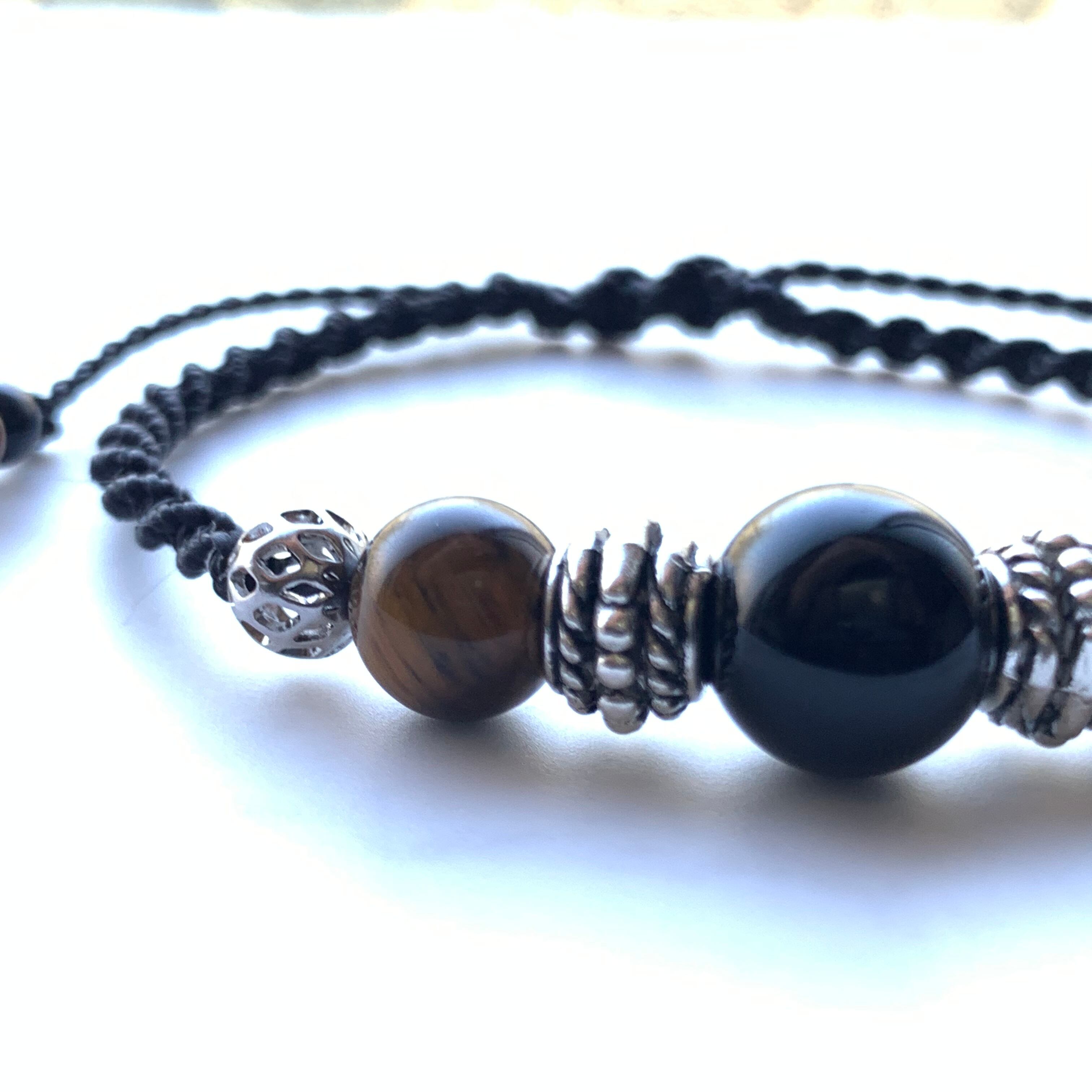 オニキスとタイガーアイのマクラメ編みブレスレットです。