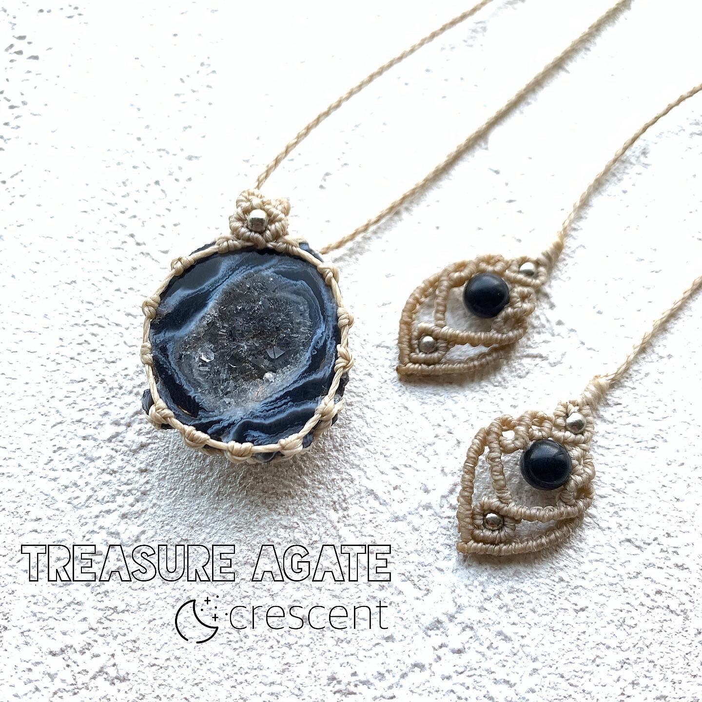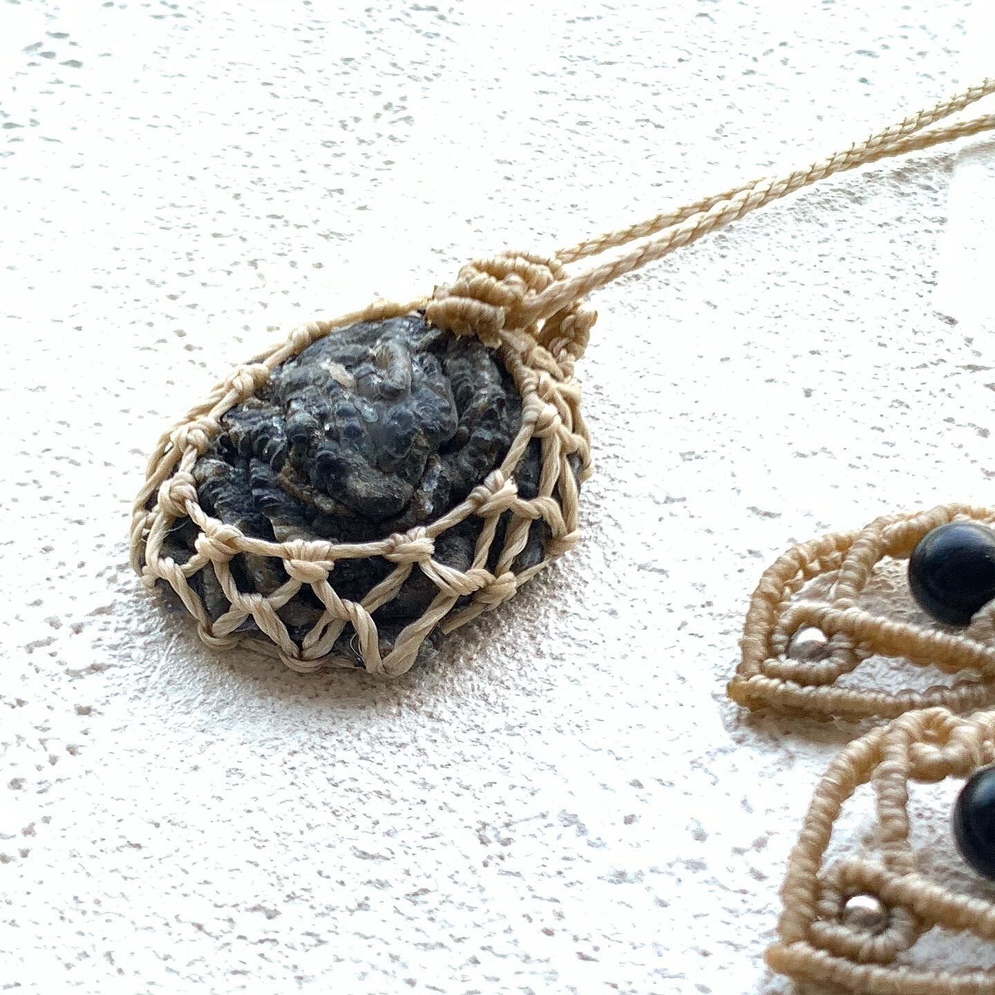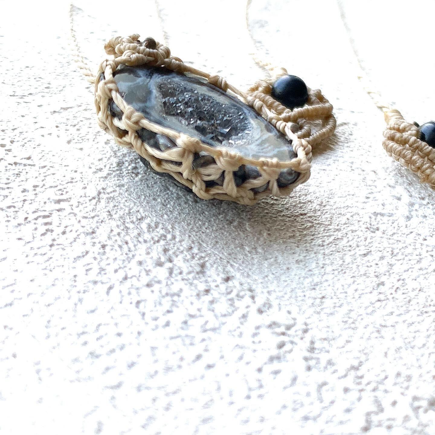 トレジャーアゲートの小さなクラスターを大きな網目で包んだマクラメ編みネックレスです。