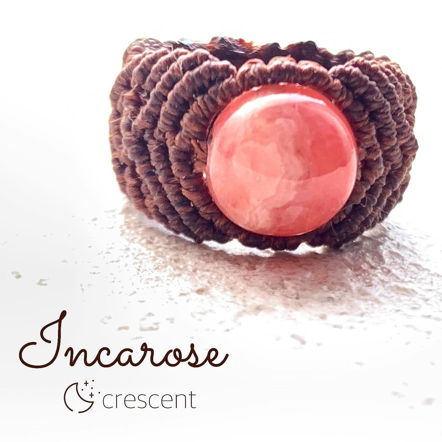 インカローズ(ロードクロサイト)で編んだ大ぶりのマクラメ編みリングです。