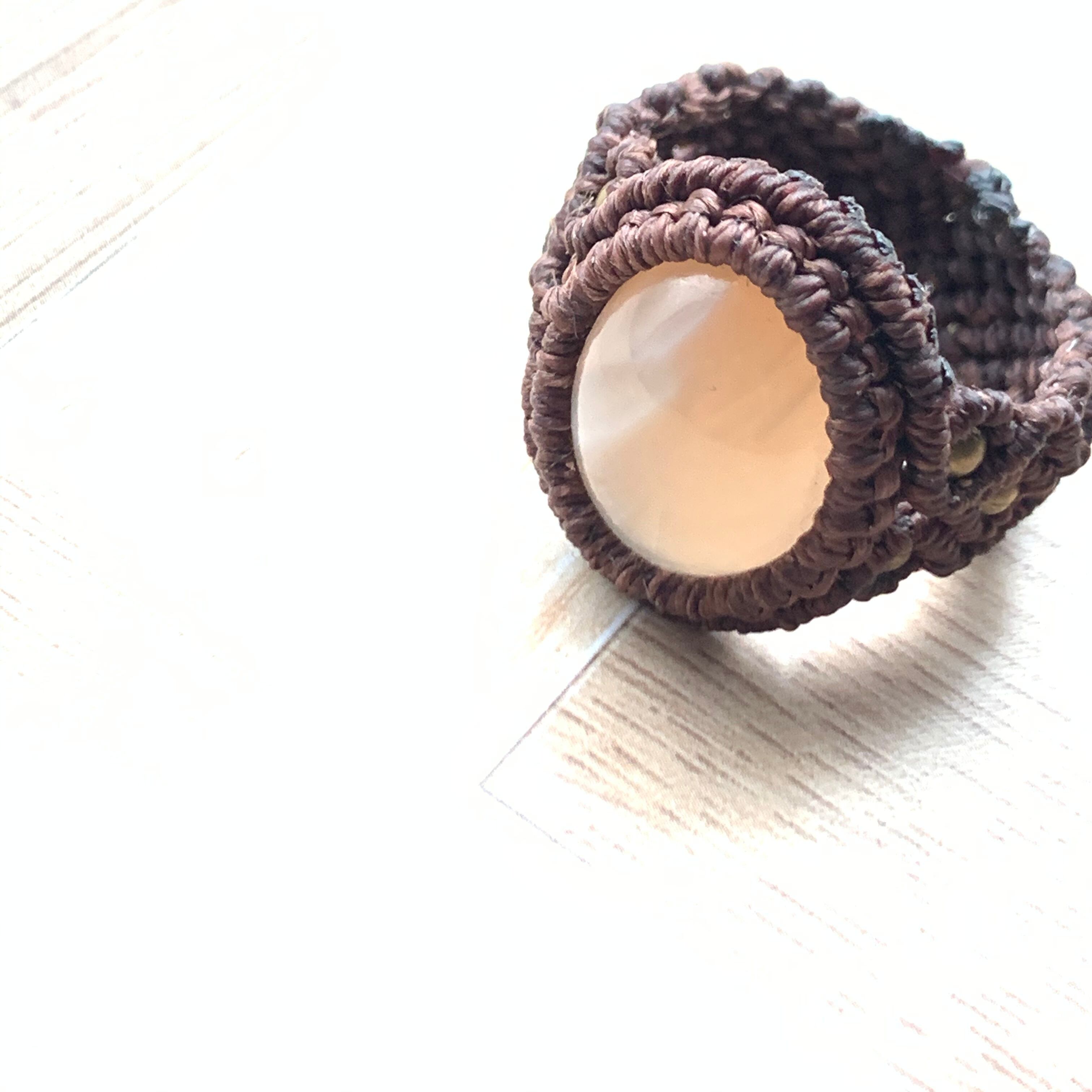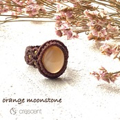 オレンジムーンストーンのカボションで編んだ大ぶりのマクラメ編みリングです。