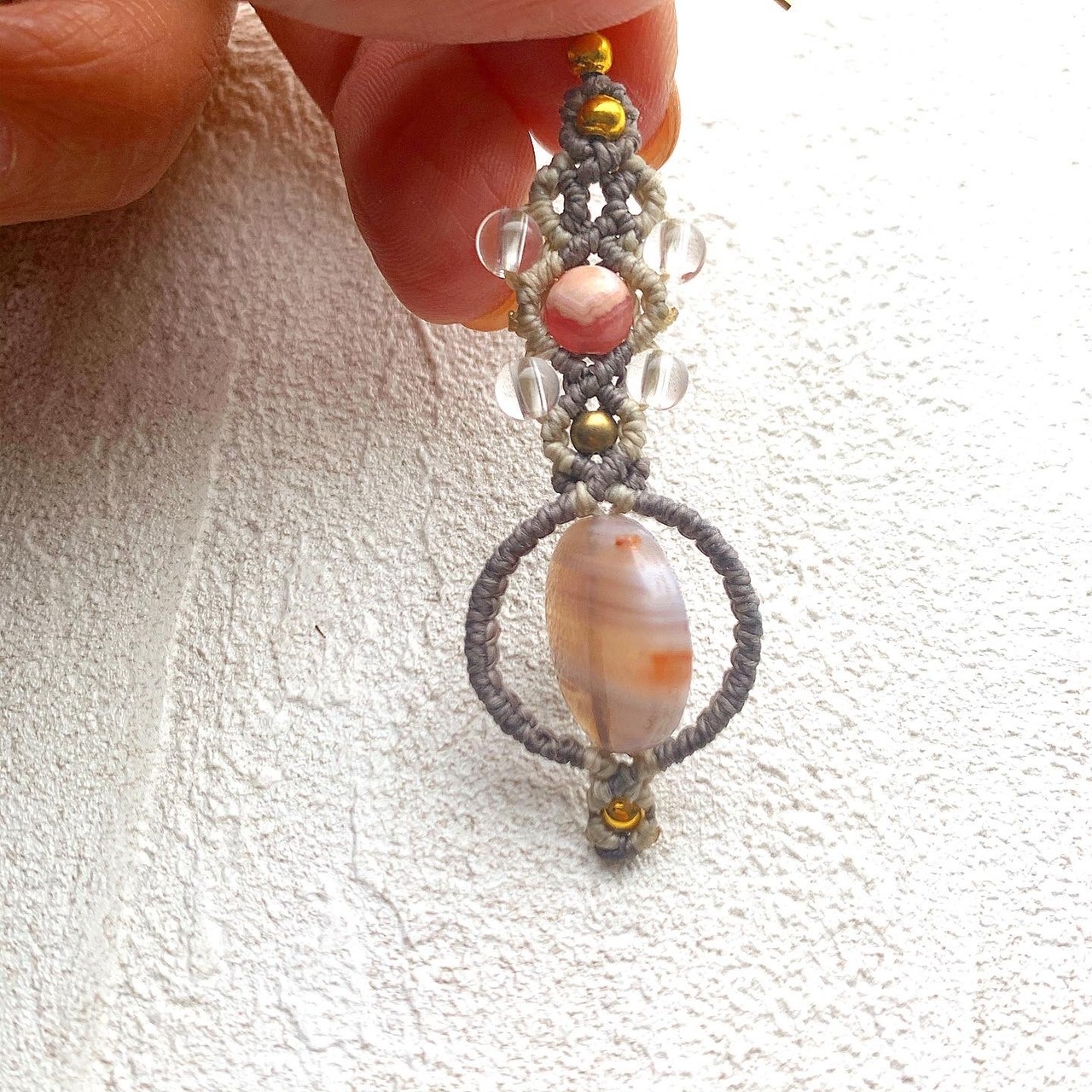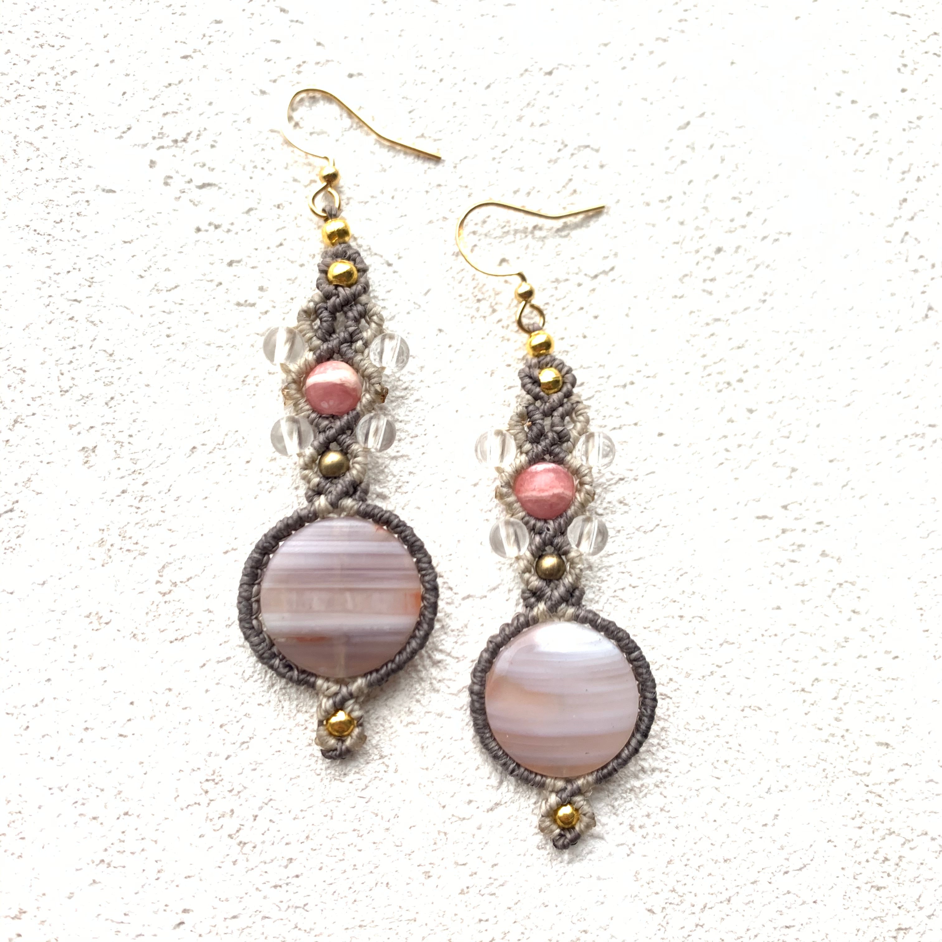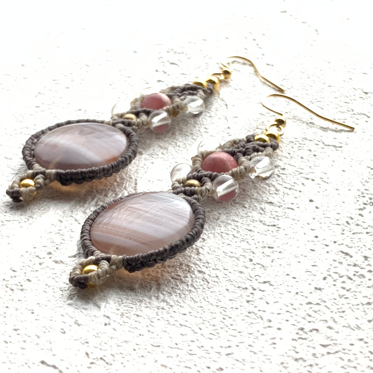 インカローズとロータスアゲートのマクラメ編みピアスです。