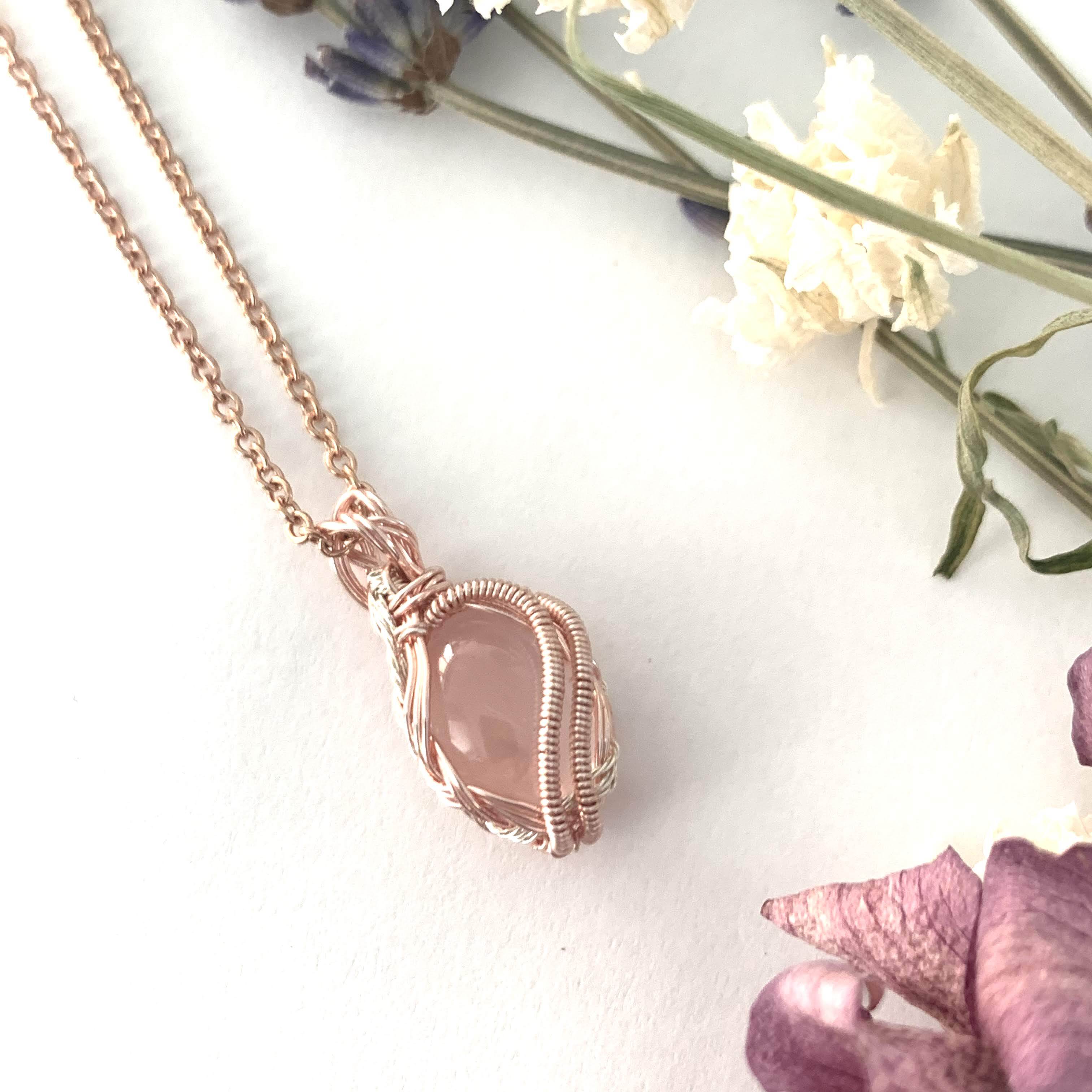 ローズクォーツを使用した色味の可愛いワイヤーアートネックレスです。