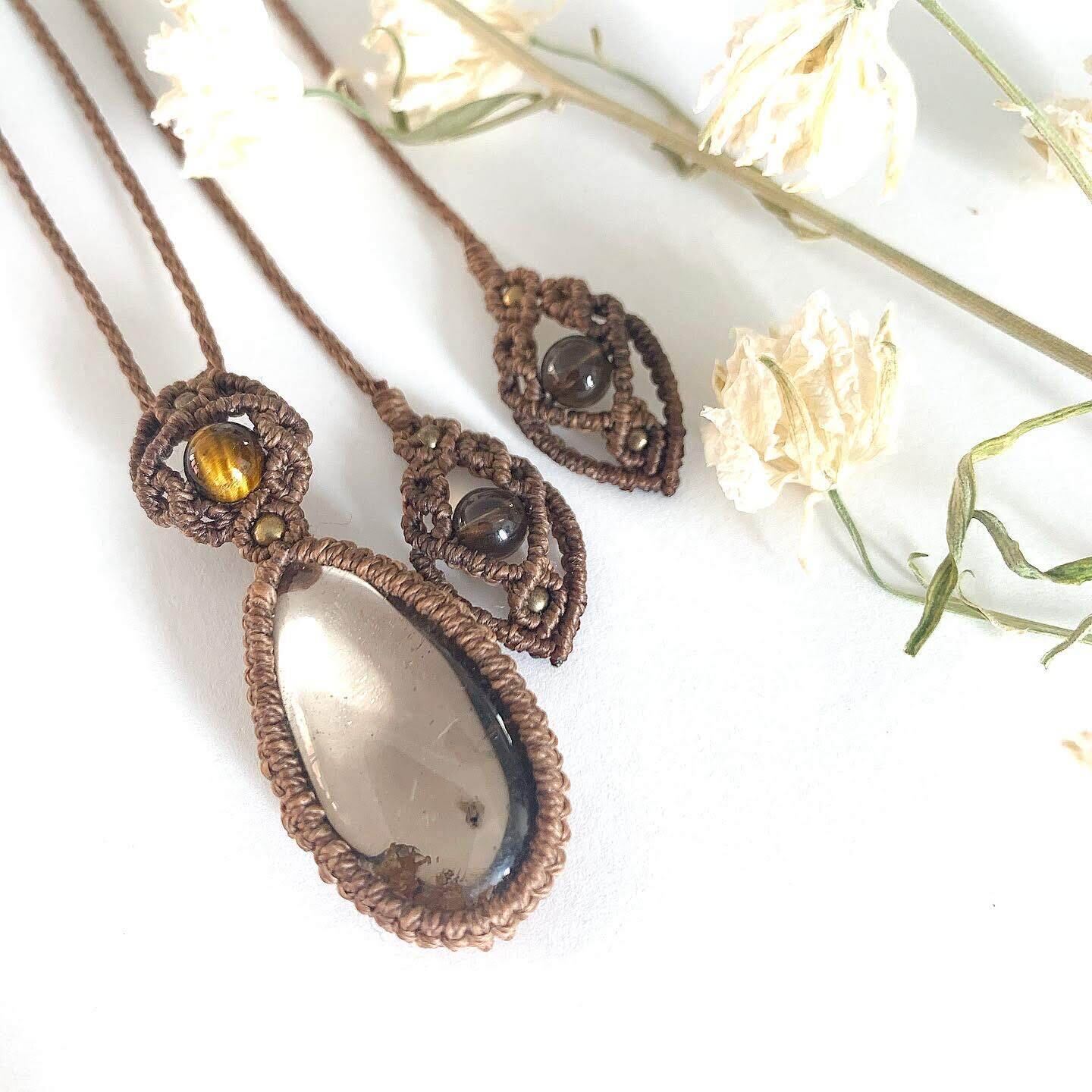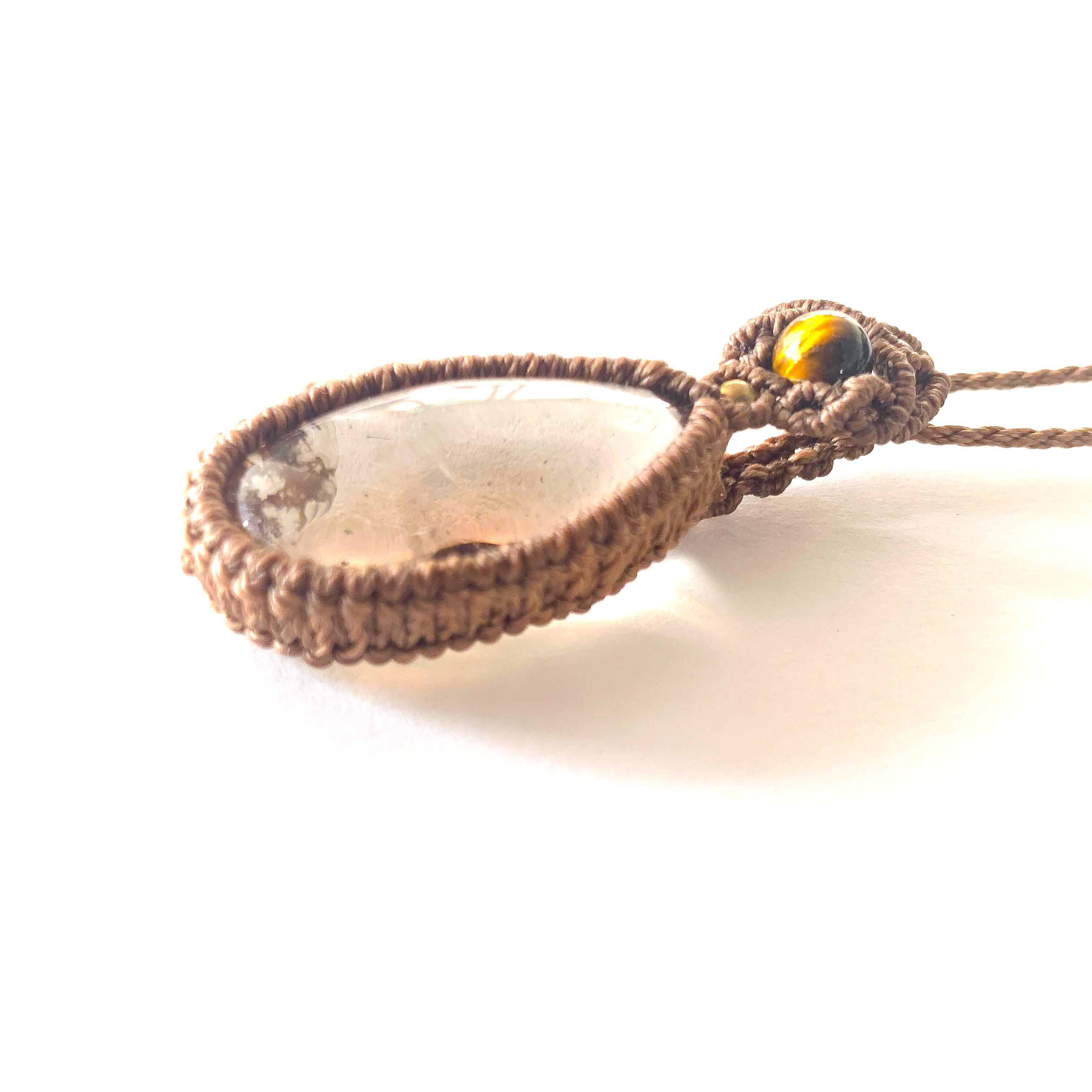 大きめのガーデンクォーツとタイガーアイを合わせたマクラメ編みネックレスです。