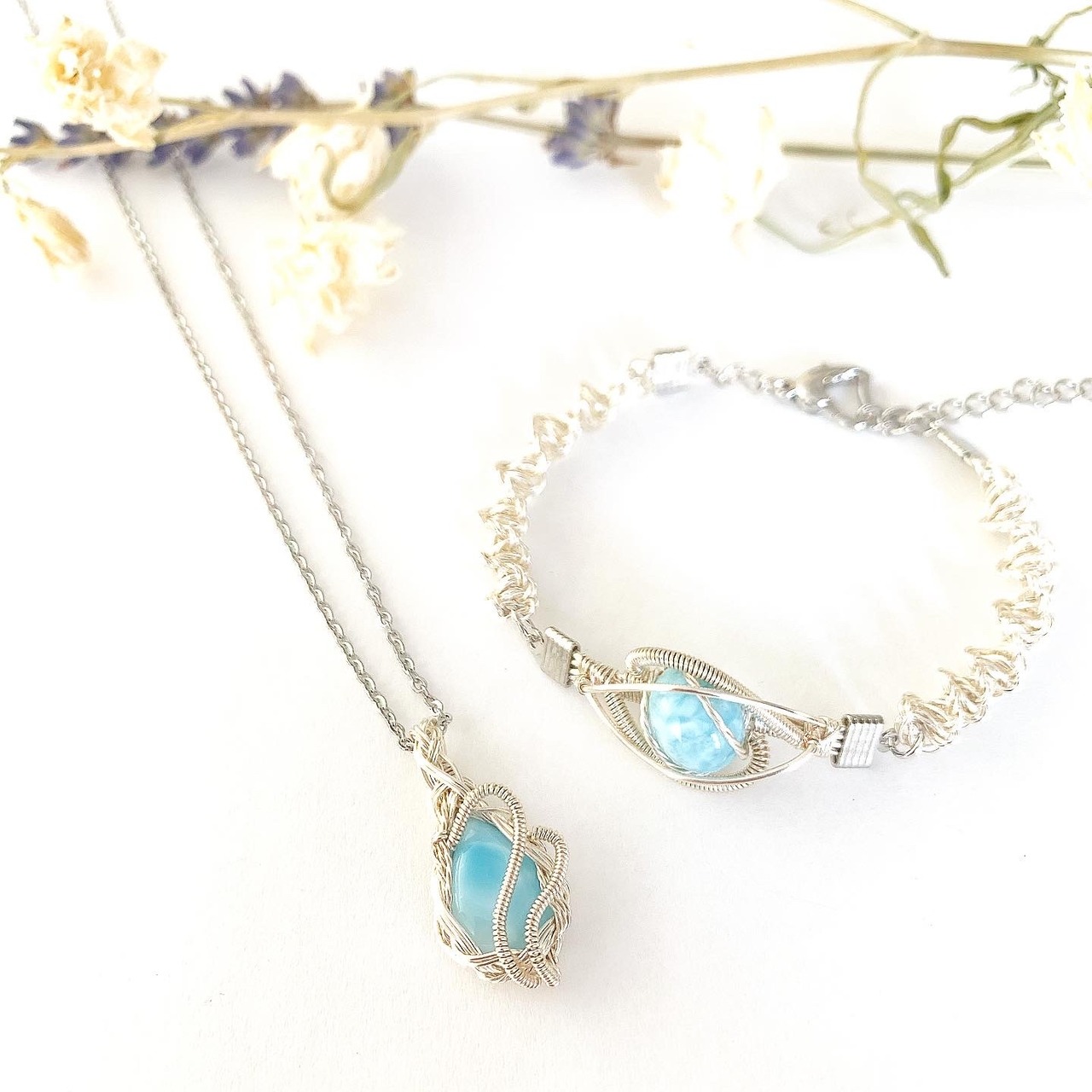 ラリマーのワイヤーアートネックレス