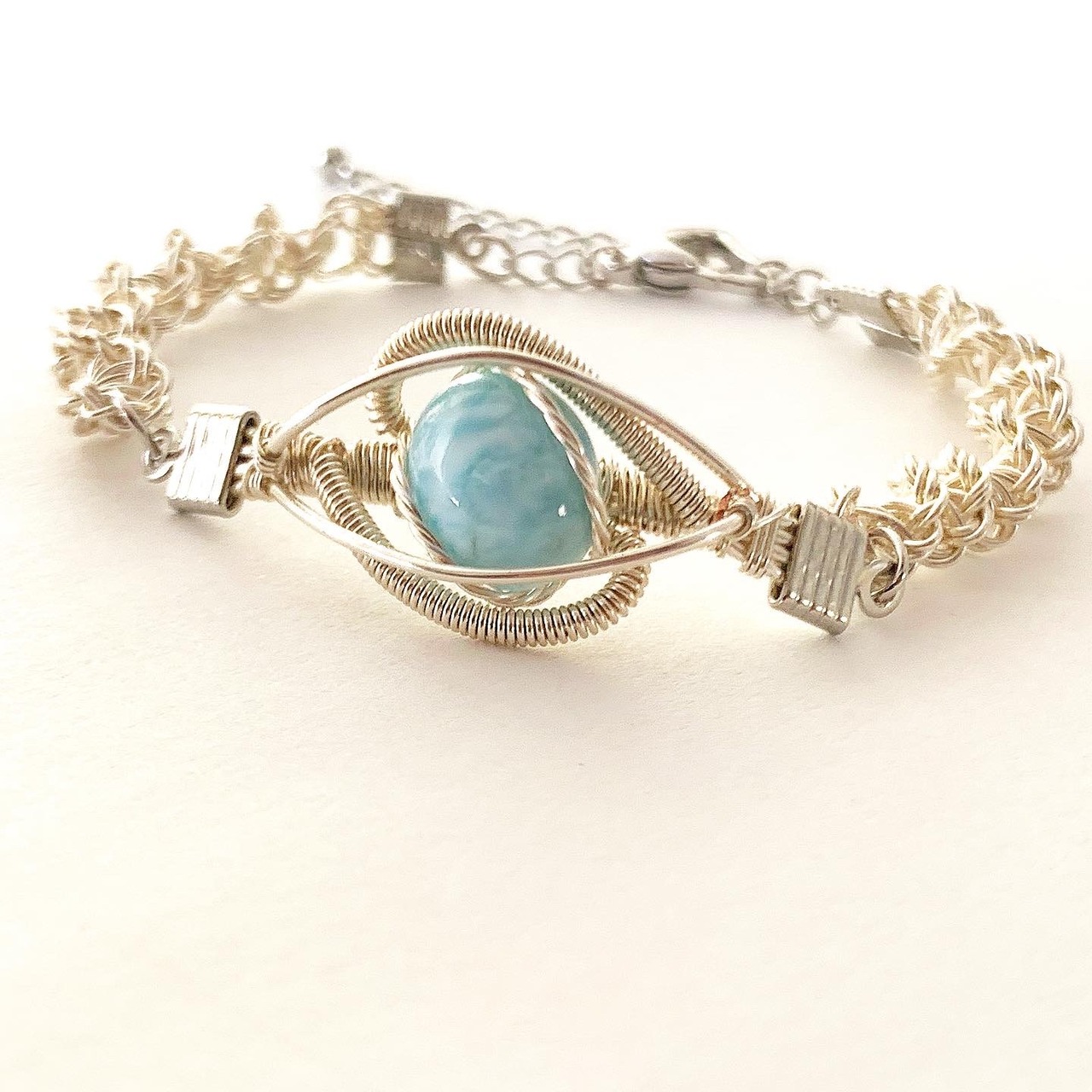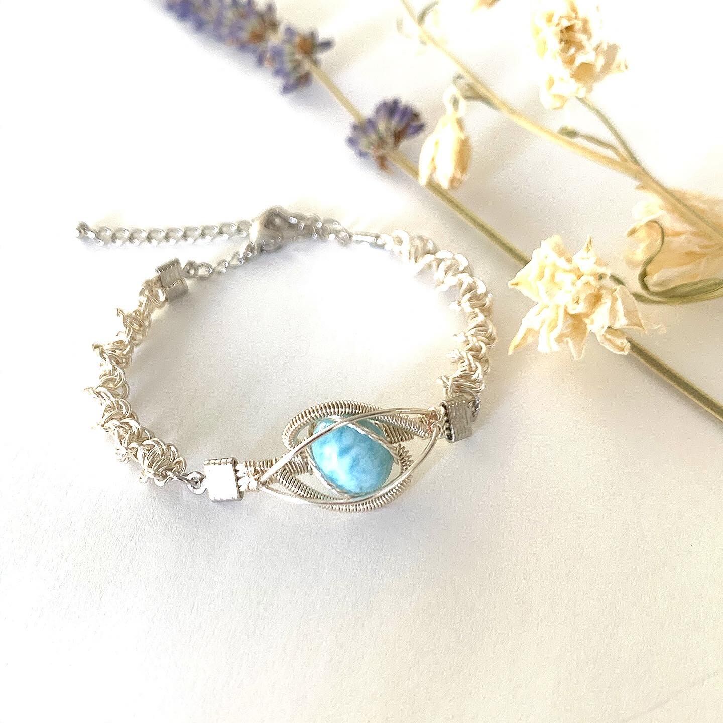 小ぶりのラリマーを使った上品な仕上がりのワイヤーアートブレスレットです。