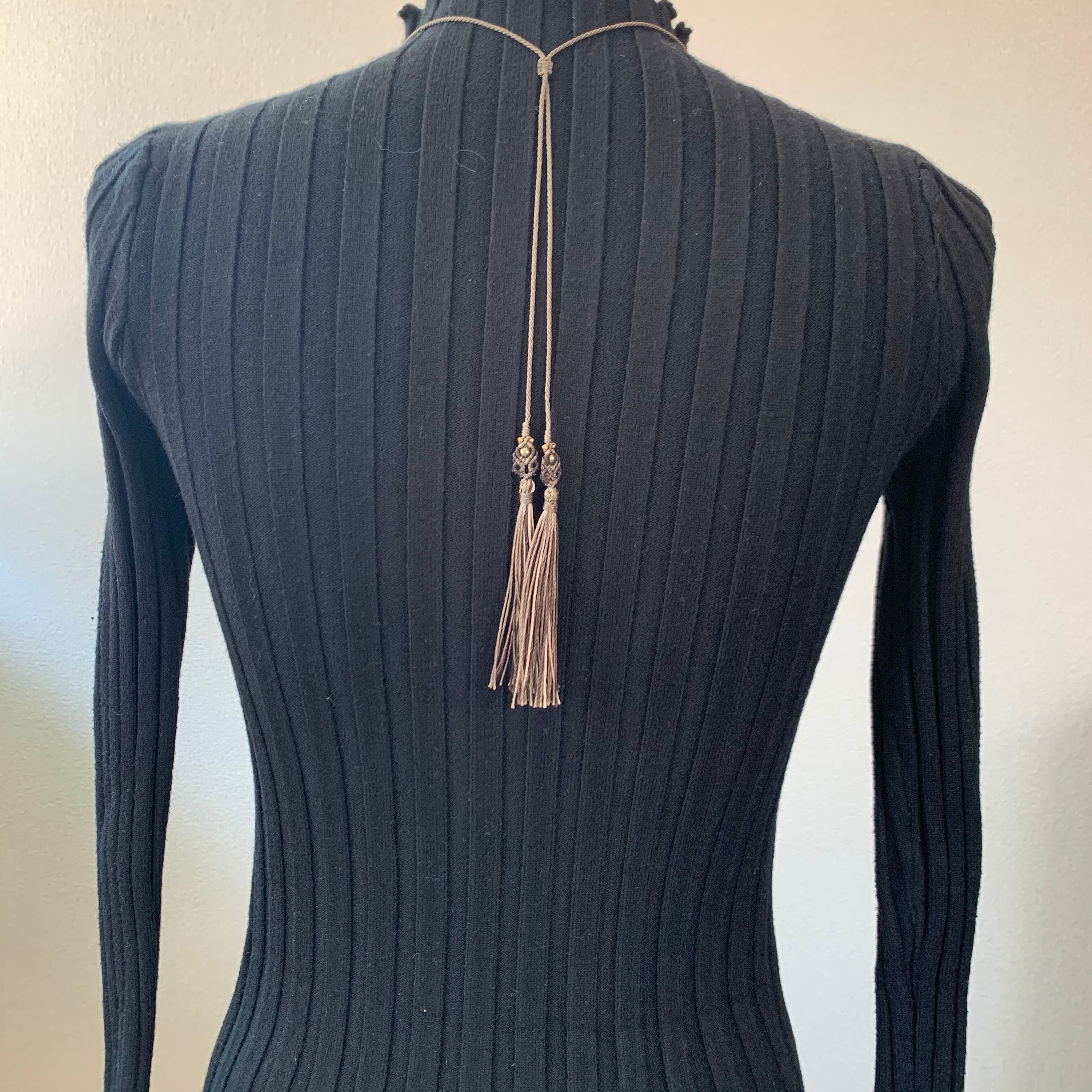 大ぶりのフォッシルコーラルにシンプルなバチカンの装飾と、ストラップのタッセルが豪華な印象のマクラメ編みネックレスです。