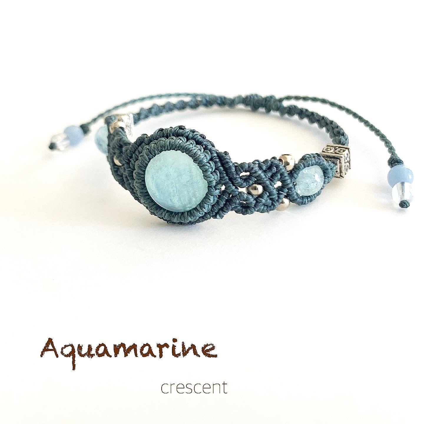 クールな印象に編み上げたアクアマリンのマクラメ編みブレスレットです。