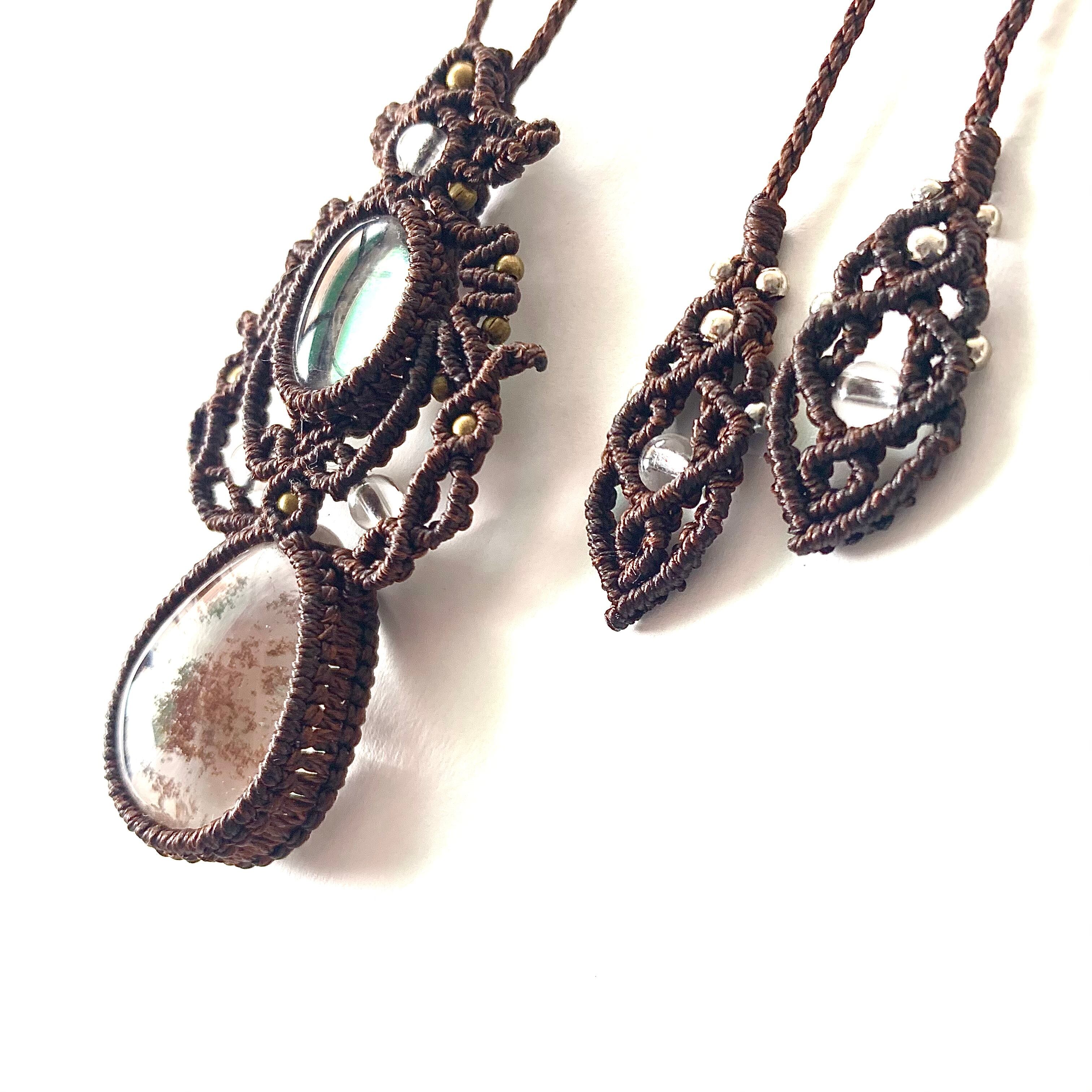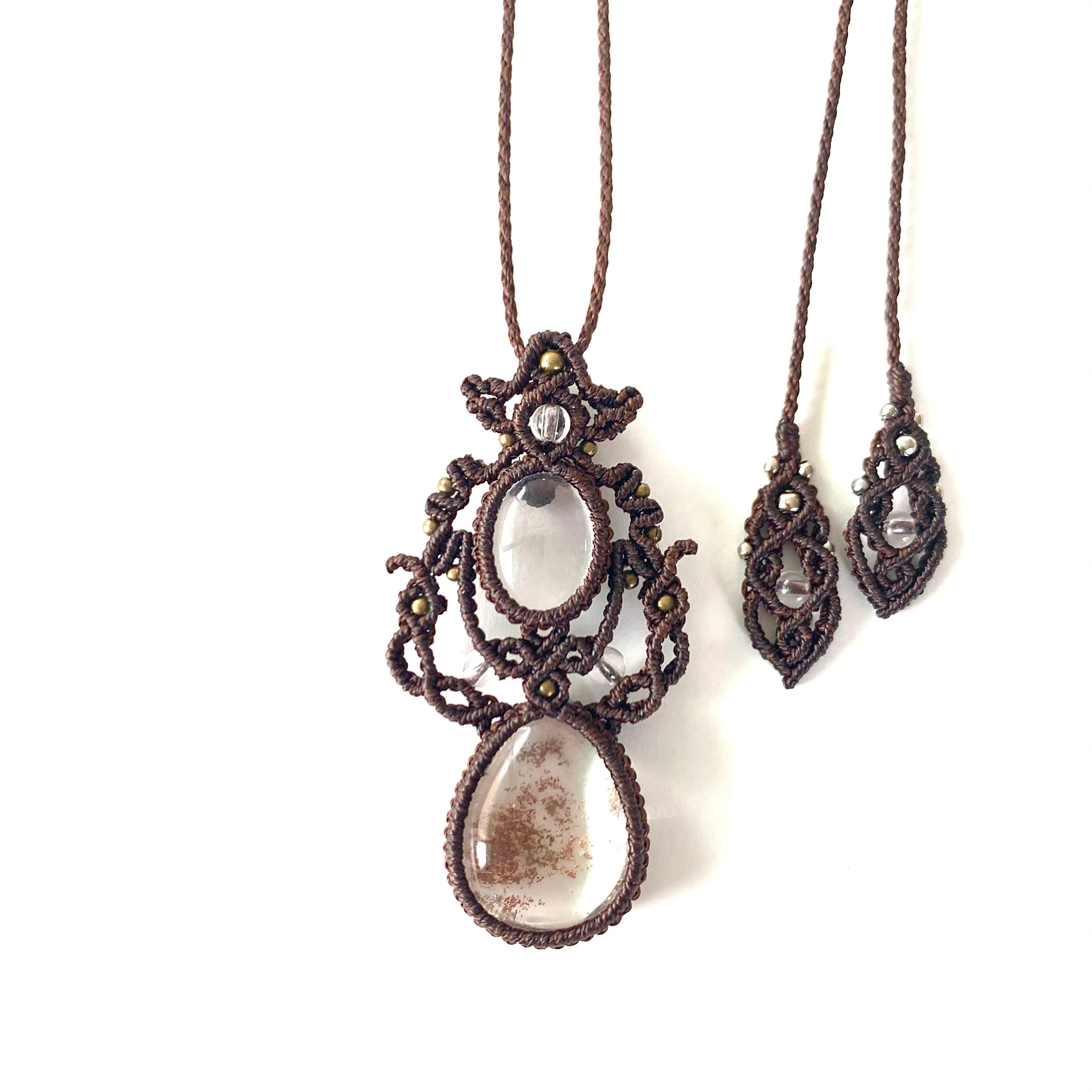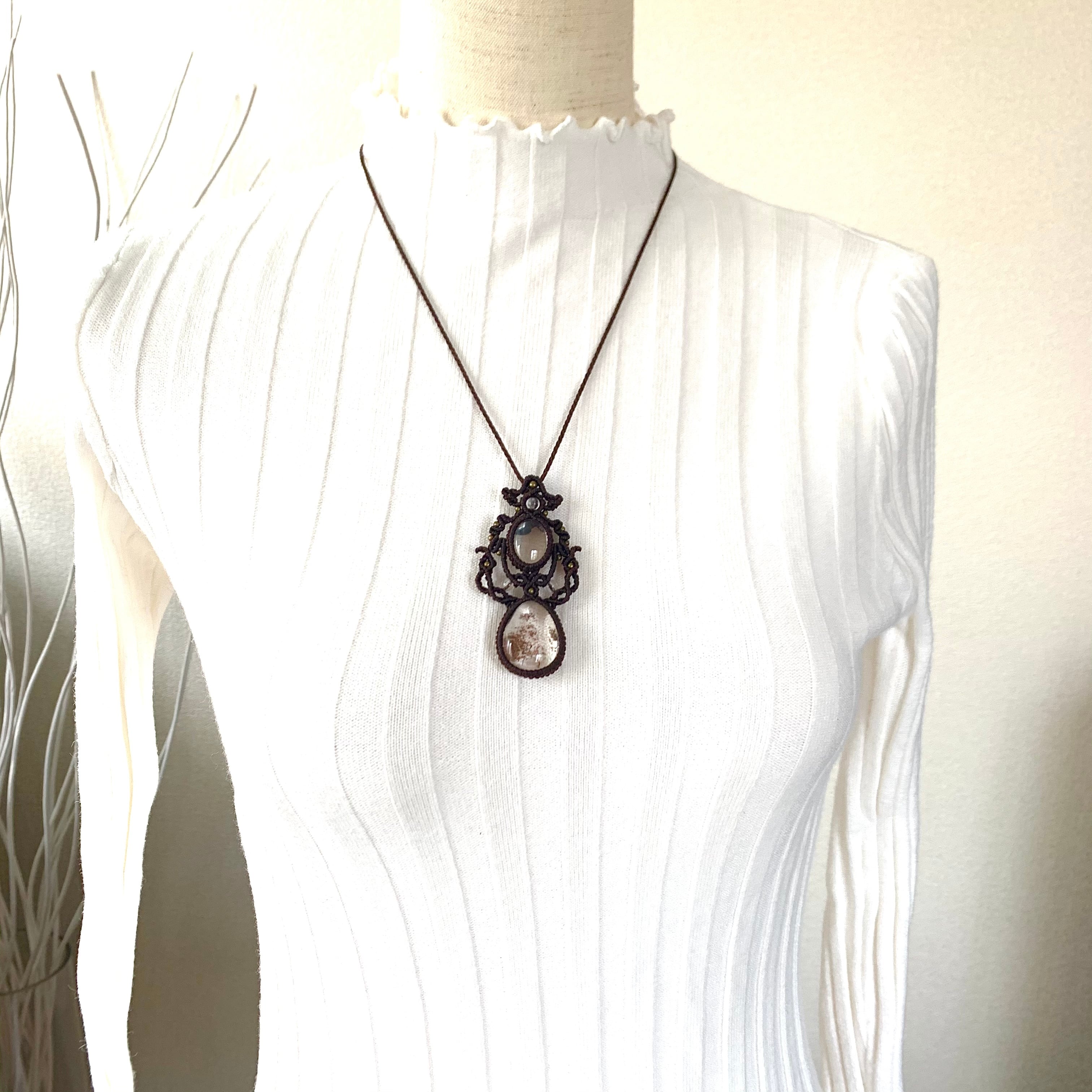 しずく型のガーデンクォーツと透明度の高い水晶を使ったマクラメ編みネックレスです。