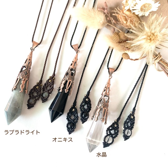 ポイントの天然石とメタルキャップでデザインされたペンダントトップに、マクラメ編みのストラップを合わせたネックレスです。