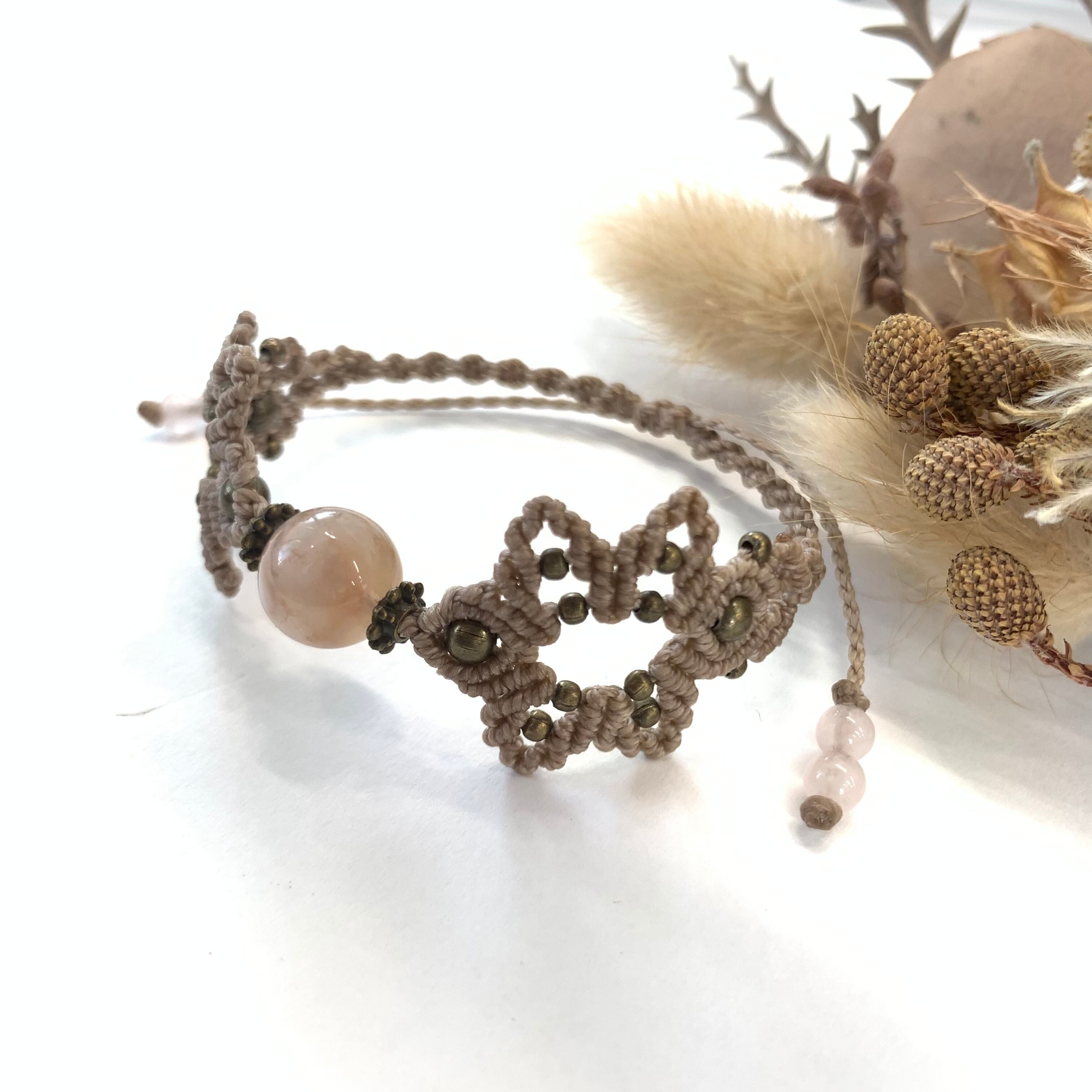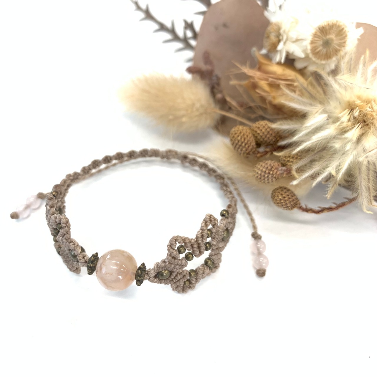 10mmのチェリーブロッサムアゲートを使用したお花モチーフのマクラメ編みブレスレットです。