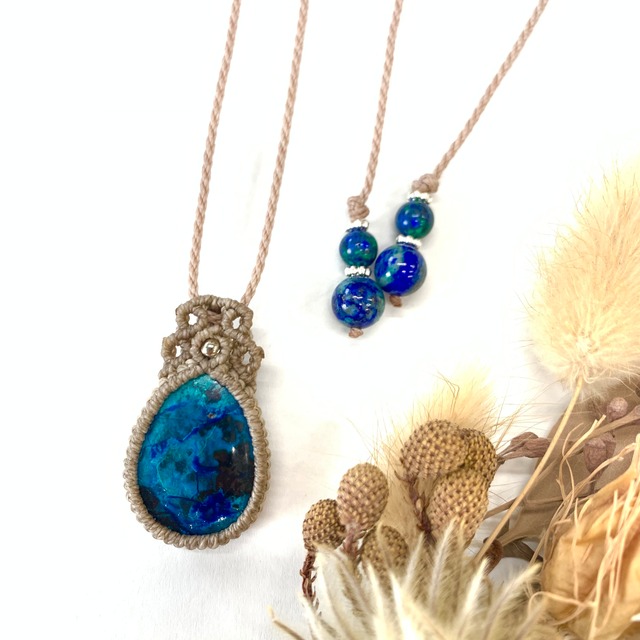 クリソコラのカボションをシンプルに編み上げたマクラメ編みネックレスです。