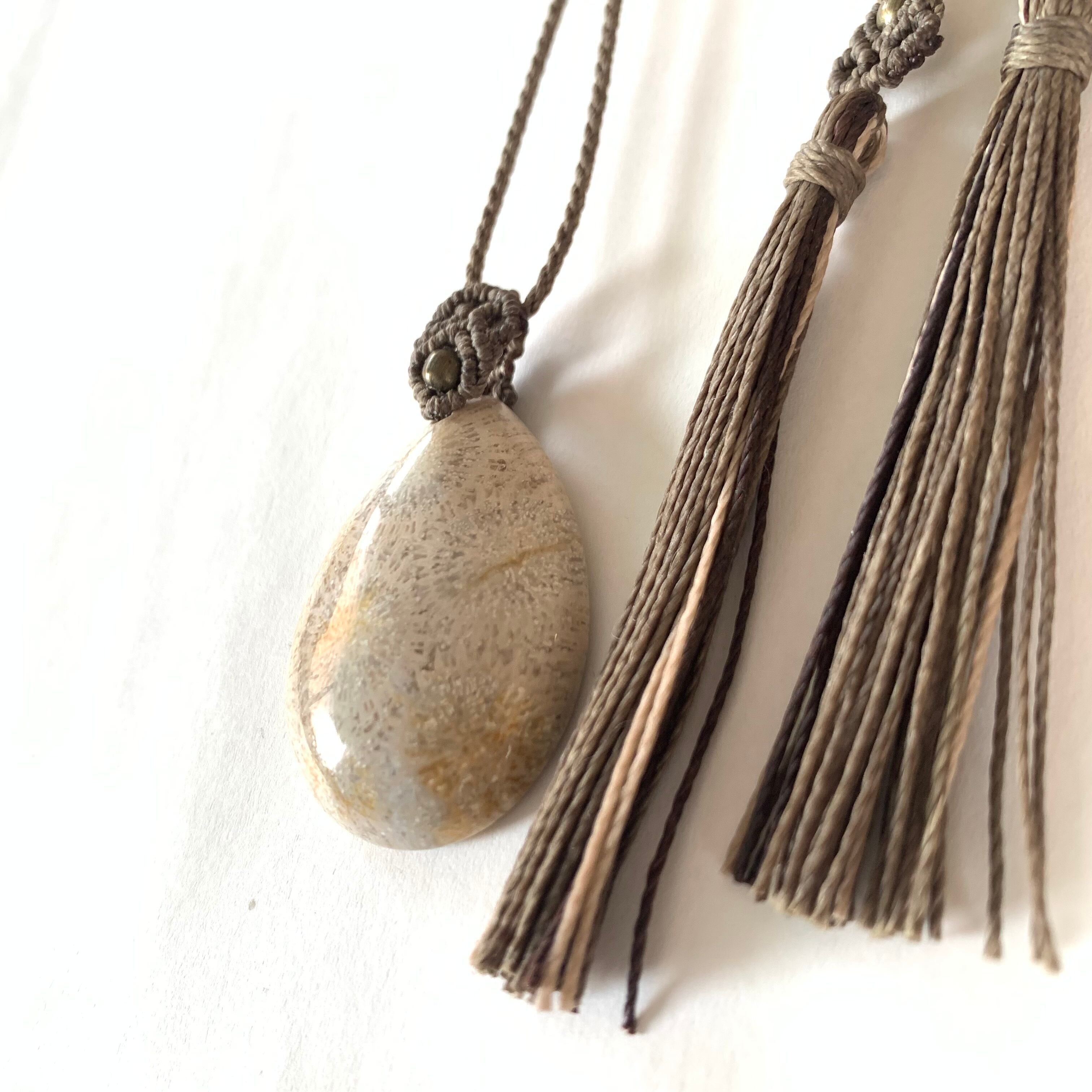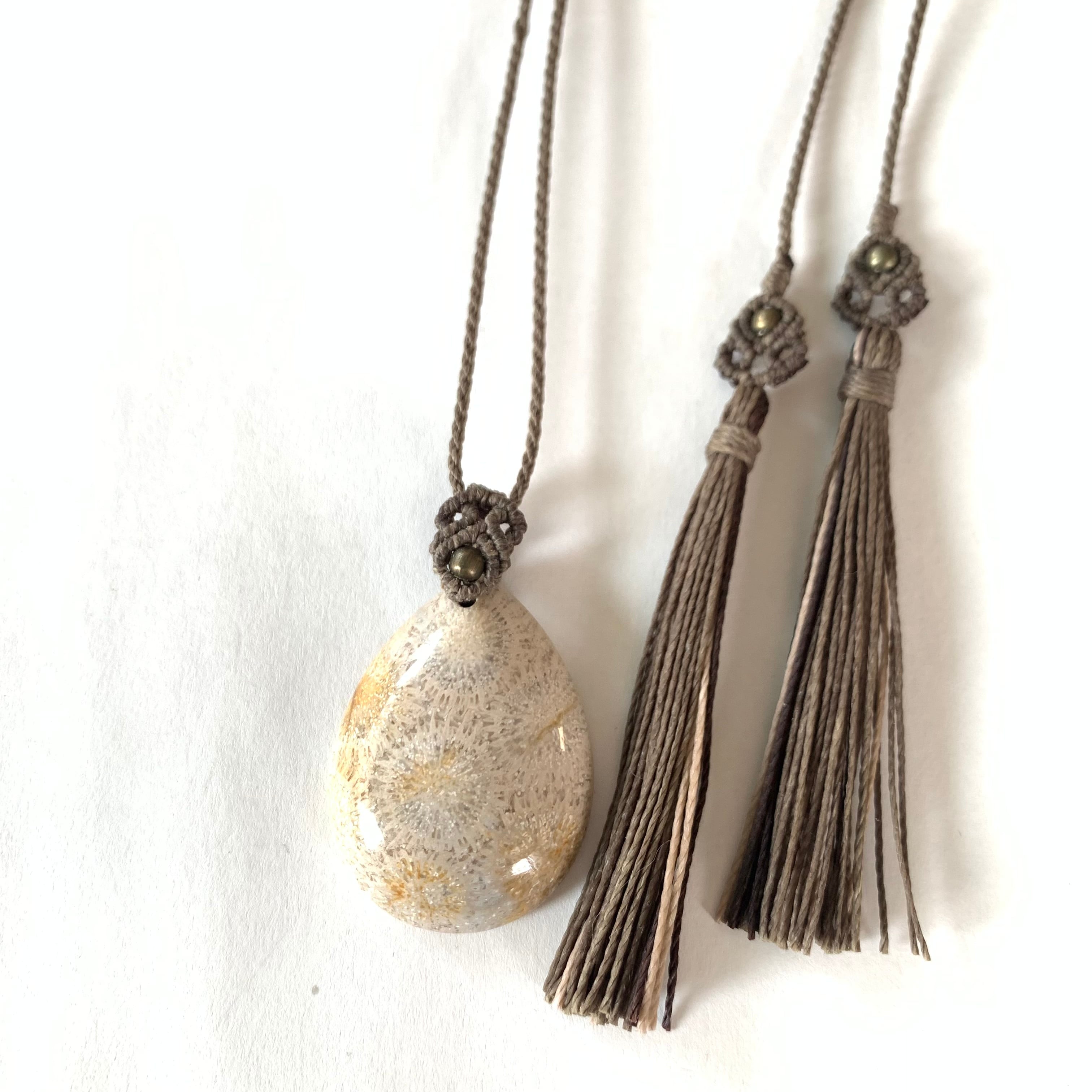 ポテっとしたフォルムと独特な模様が可愛いフォッシルコーラル(珊瑚の化石)のマクラメ編みネックレスです。