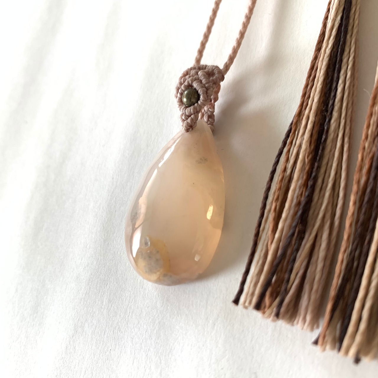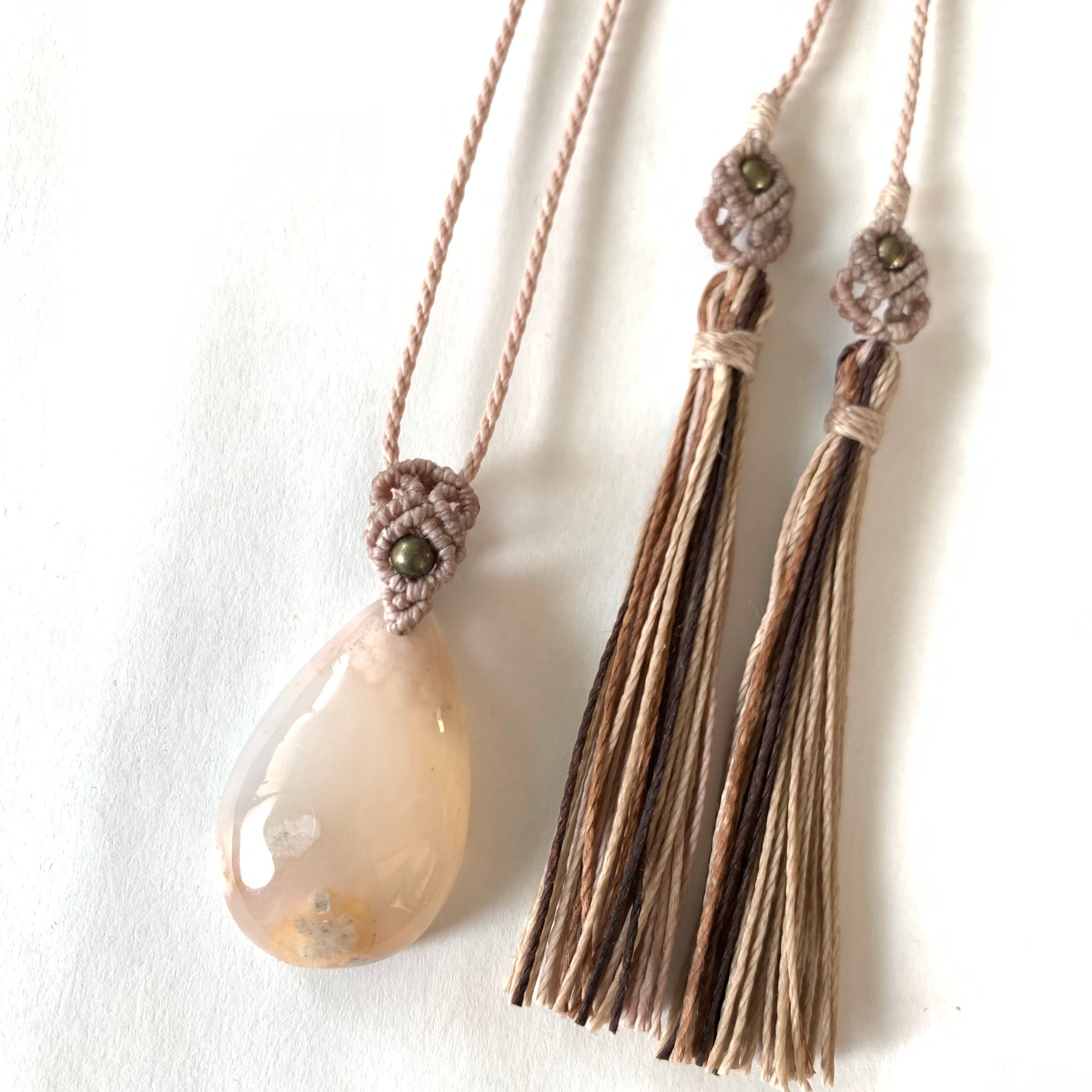 ピンクの桜のような模様が可愛い、瑪瑙のマクラメ編みネックレスです。